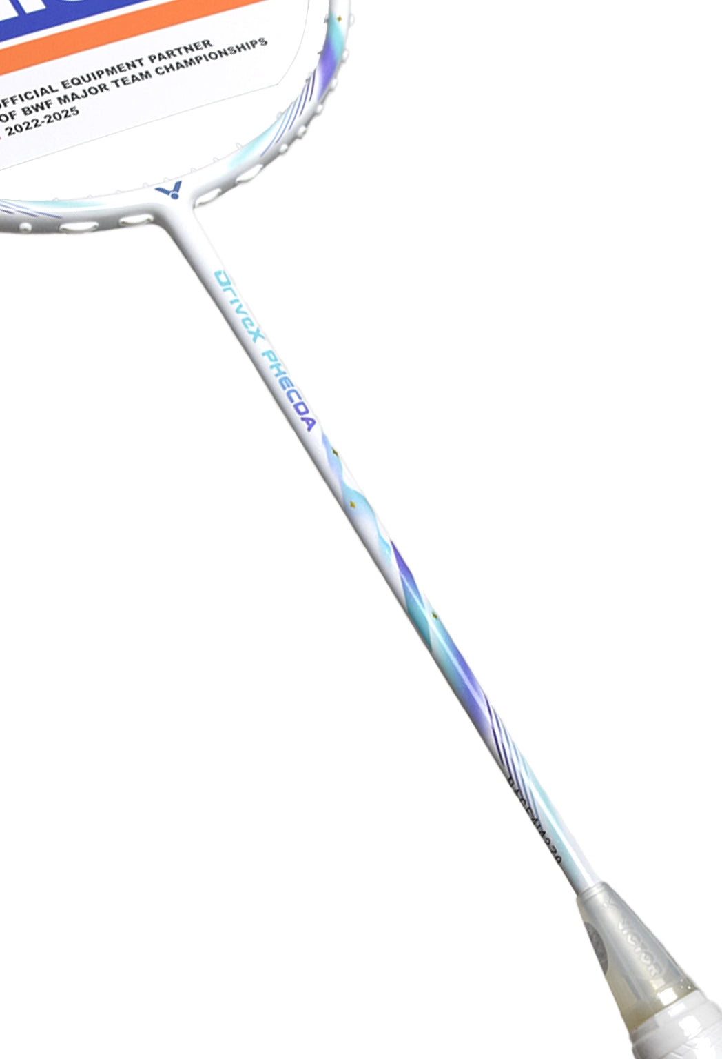 The Victor DriveX PHECDA is a high-performance addition to the DriveX series, offering a perfect balance of control, speed, and cutting-edge technology. Featuring a 6.6mm PYROFIL shaft and WES 2.0, it delivers precise shots with enhanced swing speed and repulsion, while the box-shaped frame boosts stability and supports higher string tension. Its striking white design with turquoise and purple accents adds a bold, modern touch.